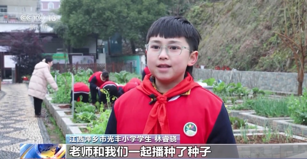 在江西萍鄉(xiāng),光豐小學(xué)的老師將新學(xué)期的第一課放到了室外,孩子們來到菜園實(shí)地觀察各種農(nóng)作物,將手中的蔬菜種子播撒在土地里,親身體驗(yàn)勞動的過程。