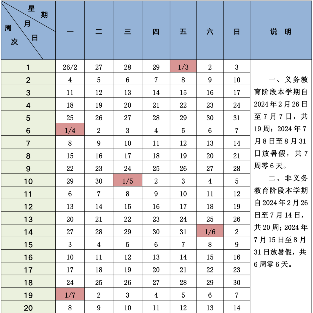 非義務(wù)教育階段第二學(xué)期于2024年2月26日(星期一)開(kāi)學(xué);2024年7月14日(星期日)結(jié)束本學(xué)期工作,共20周;2024年7月15日(星期一)至8月31日(星期六)放暑假,共6周零6天。