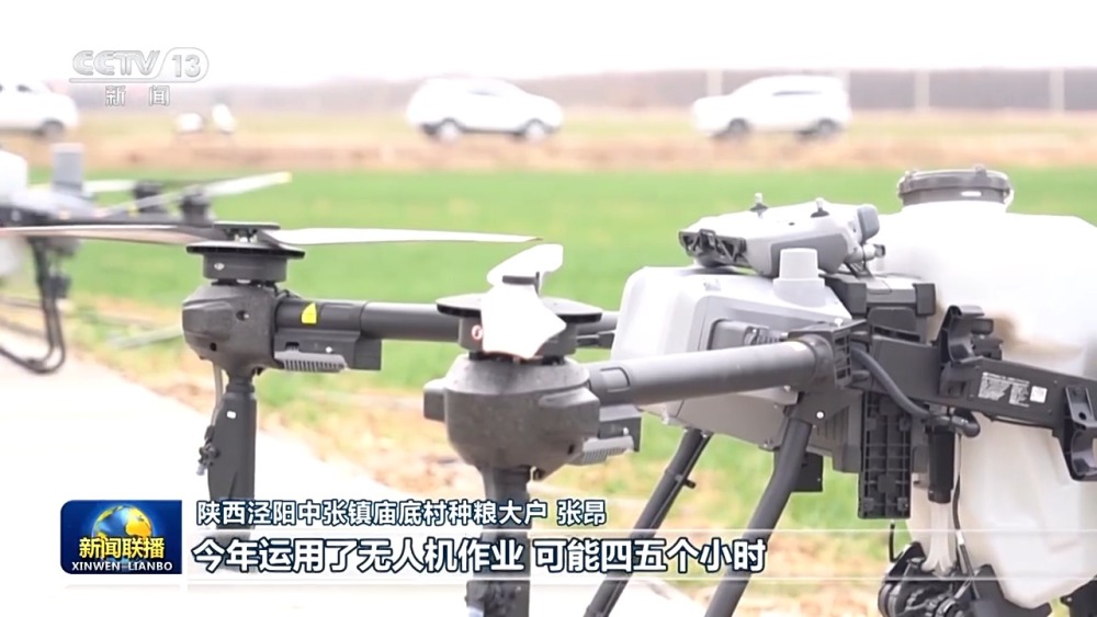 陜西涇陽中張鎮(zhèn)廟底村種糧大戶 張昂:往年我們用的人工噴灑,作業(yè)時(shí)間長,而且成本也比較高,今年運(yùn)用了無人機(jī)作業(yè),可能四五個(gè)小時(shí),把我這兩千畝麥田的作業(yè)就基本完成了,而且還省錢。