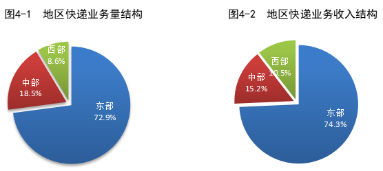 1-2月,東、中、西部地區(qū)快遞業(yè)務量比重分別為72.9%、18.5%和8.6%,業(yè)務收入比重分別為74.3%、15.2%和10.5%。與去年同期相比,東部地區(qū)快遞業(yè)務量比重下降2.2個百分點,快遞業(yè)務收入比重下降1.2個百分點;中部地區(qū)快遞業(yè)務量比重上升1.5個百分點,快遞業(yè)務收入比重上升0.7個百分點;西部地區(qū)快遞業(yè)務量比重上升0.7個百分點,快遞業(yè)務收入比重上升0.5個百分點。