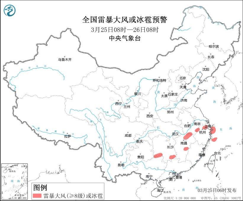 預(yù)計(jì)3月25日08時(shí)至26日08時(shí),安徽南部、湖南南部、江西中北部、浙江北部、廣西東北部等地的部分地區(qū)將有8—10級雷暴大風(fēng)或冰雹天氣;安徽南部、江蘇南部、上海西南部、湖南南部、江西、浙江中北部和東南部、福建西北部、廣西東北部等地的部分地區(qū)將有短時(shí)強(qiáng)降水天氣,最大小時(shí)雨量20-40毫米,局地可達(dá)50毫米以上。
