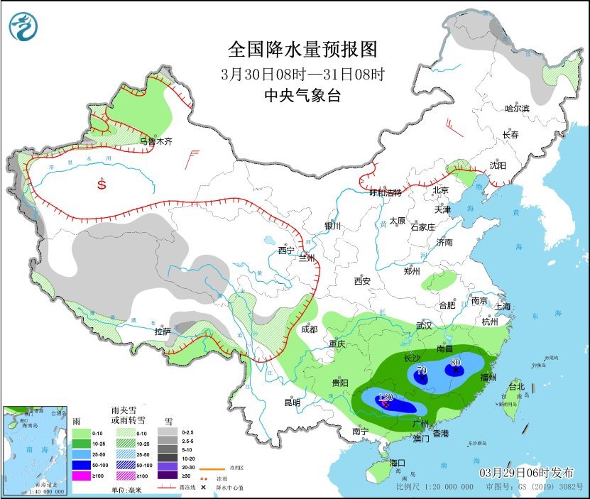 3月30日8時(shí)至31日8時(shí),黑龍江北部、新疆南疆高海拔山區(qū)、西藏大部、青海西部、川西高原南部等地部分地區(qū)有小到中雪或雨夾雪。湖南中南部、江南中南部、福建大部、廣西西北部、廣東大部等地部分地區(qū)有中到大雨,其中,湖南東南部、江西西南部和東部、福建西部、廣西東北部、廣東西部等地部分地區(qū)有暴雨或大暴雨(100~120毫米)。內(nèi)蒙古東南部、新疆東部等地部分地區(qū)有4~5級風(fēng)。
