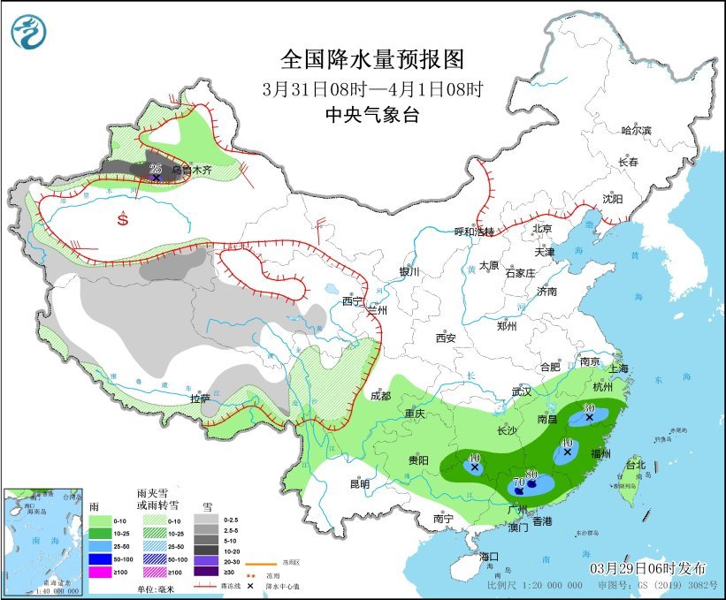 3月31日8時(shí)至4月1日8時(shí),新疆沿天山高海拔地區(qū)、西藏中北部、青海西部、川西高原等地部分地區(qū)有小到中雪或雨夾雪,其中,新疆沿天山地區(qū)和伊犁河谷等地部分地區(qū)有大到暴雪,局地大暴雪(20~25毫米)。浙江南部、江西東部和南部、湖南南部、貴州東南部、廣西東北部、廣東中北部、福建等地部分地區(qū)有中到大雨,其中,廣東北部等地部分地區(qū)有暴雨(50~80毫米)。新疆南疆盆地和東部、甘肅河西等地部分地區(qū)有4~6級風(fēng)。