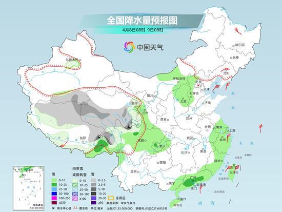 預(yù)計今天(4月8日),江南、華南等地降雨將明顯減少減弱,迎來降雨間歇期。但在青藏高原中東部,未來三天仍將出現(xiàn)持續(xù)性雨雪天氣。此外,今明兩天,東北、華北等地在冷空氣以及降水的影響下,氣溫將普遍下降。冷空氣過后,上述地區(qū)氣溫又會快速回升。