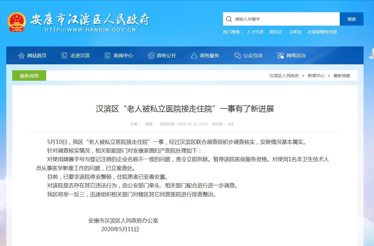 中新網(wǎng)5月12日電 據(jù)陜西安康市漢濱區(qū)人民政府網(wǎng)站消息,對(duì)于安康市漢濱區(qū)“老人被私立醫(yī)院接走住院”一事,經(jīng)漢濱區(qū)聯(lián)合調(diào)查組初步調(diào)查核實(shí),反映情況基本屬實(shí)。目前,已要求該院停業(yè)整頓,住院患者已妥善安置。