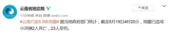中新網(wǎng)5月19日電 據(jù)云南省地震局官方微博消息,據(jù)當(dāng)?shù)卣块T統(tǒng)計(jì),截至5月19日4時(shí)20分,地震已造成小河鎮(zhèn)2人死亡,23人受傷。