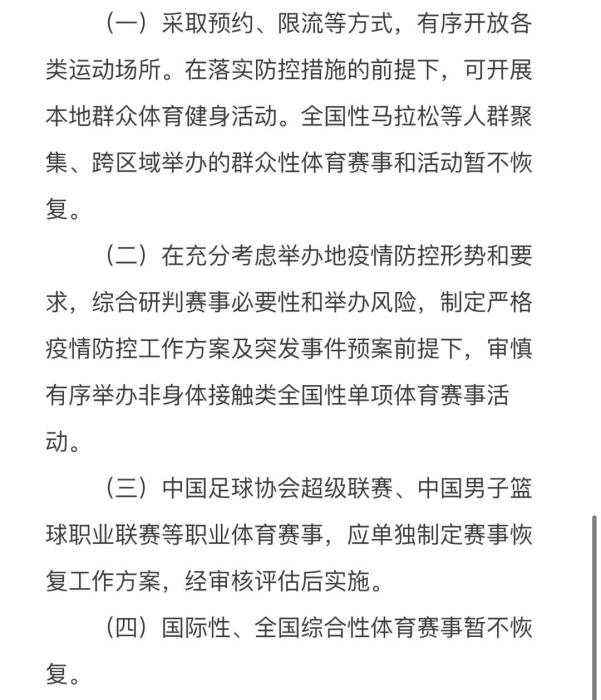 體育總局:中超、CBA等應(yīng)單獨(dú)制定賽事恢復(fù)工作方案