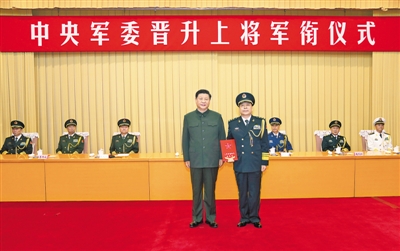 下午4時30分許,晉銜儀式在莊嚴(yán)的國歌聲中開始。中央軍委副主席許其亮宣讀了中央軍委主席習(xí)近平簽署的晉升上將軍銜命令。中央軍委副主席張又俠主持晉銜儀式。
