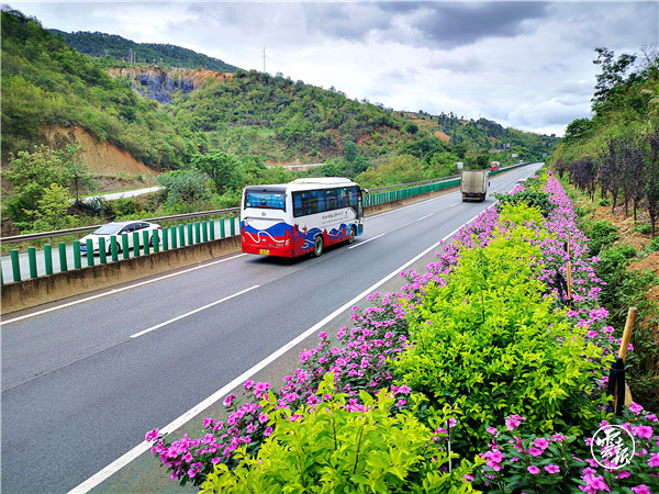 仲夏時節(jié),昆磨高速普洱至景洪段的羊蹄甲、紫薇、火把花等植物百花齊放,大風(fēng)埡口隧道口姹紫嫣紅的三角梅,寧洱收費站立交粉嫩養(yǎng)眼的金絲桃,高速中央隔離帶嬌艷欲滴的木槿,在幾場雨水的洗禮和管理處的精心養(yǎng)護下,變得生機盎然。昆磨高速普洱管理處轄區(qū)管養(yǎng)路段植被豐富,公路蜿蜒穿梭在青山綠水間,共設(shè)有5個立交苗圃基地示范區(qū),以開花喬木為主,地被為輔,四季開花,豐富了植物層次,一立交一風(fēng)景,樹綠花紅的景象與高速公路融為一體交相輝映。