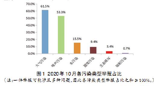 從污染類型來看,10月大氣污染舉報最多,占舉報總量的61.5%,該占比比9月同類占比減少1.5%。其次為噪聲污染舉報,占舉報總量的53.3%。水污染、固廢污染、生態(tài)破壞和輻射污染舉報分別占舉報總量的15.5%、9.4%、3.4%和0.7%。