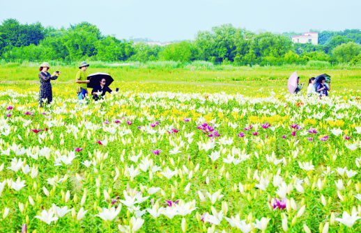 5月27日,江華瑤族自治縣沱江鎮(zhèn)天橋村生態(tài)農(nóng)業(yè)綜合產(chǎn)業(yè)園,游客在賞花、拍照。該產(chǎn)業(yè)園種植的百合既可觀賞又可食用,面積達100余畝,每畝產(chǎn)值可達3萬元以上?;ê恿水?dāng)?shù)氐穆糜危龠M了村民增收致富。(黎實 趙媛媛 攝影報道)