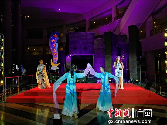 19點(diǎn)10分,“古今同樂(lè)游戲”在正門(mén)廣場(chǎng)開(kāi)始了,觀眾們玩投壺、木射、七巧板、竹竿舞、拋繡球,不僅感受到古今游戲的不同魅力,同時(shí)還欣賞到流光溢彩的南博夜景。隨后的創(chuàng)意美食冷餐會(huì)上,文物形狀的餅干和定制款綠豆糕吸引了觀眾們的目光,創(chuàng)意食品深得小朋友喜愛(ài)。20點(diǎn)整,“奇妙夜演出”準(zhǔn)時(shí)開(kāi)場(chǎng)。自治區(qū)級(jí)非遺項(xiàng)目白話童謠、傳統(tǒng)民族服飾走秀、樂(lè)舞、器樂(lè)演奏等精彩節(jié)目輪番上演,贏得了觀眾們的陣陣掌聲。