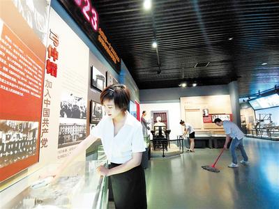 在安平縣臺(tái)城村全國(guó)第一個(gè)農(nóng)村黨支部紀(jì)念館內(nèi),工作人員正在擦拭展臺(tái)。 記者 焦 磊攝