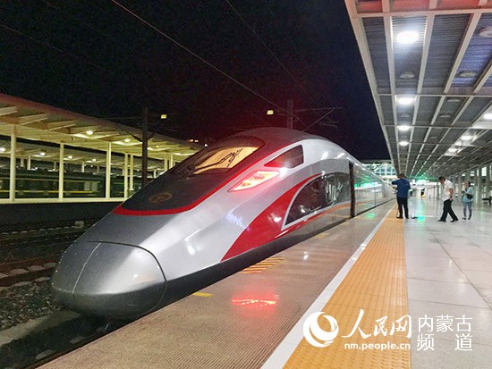 人民網(wǎng)呼和浩特6月19日電 6月18日22時10分,由CR400AF-2017動車組擔(dān)當?shù)?D1604/1次列車從呼和浩特東動車所駛出,計劃對張呼高鐵進行兼容性試驗,這也是復(fù)興號動車組列車首次“探訪”草原高鐵。