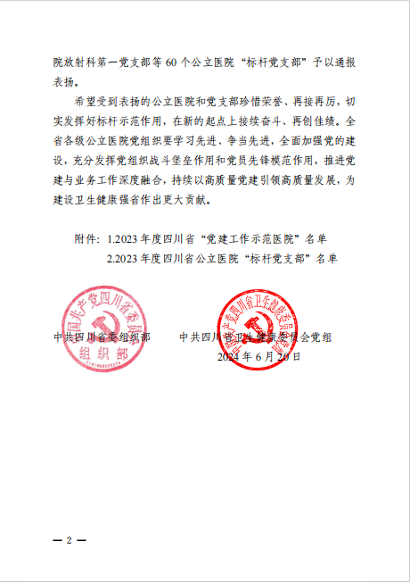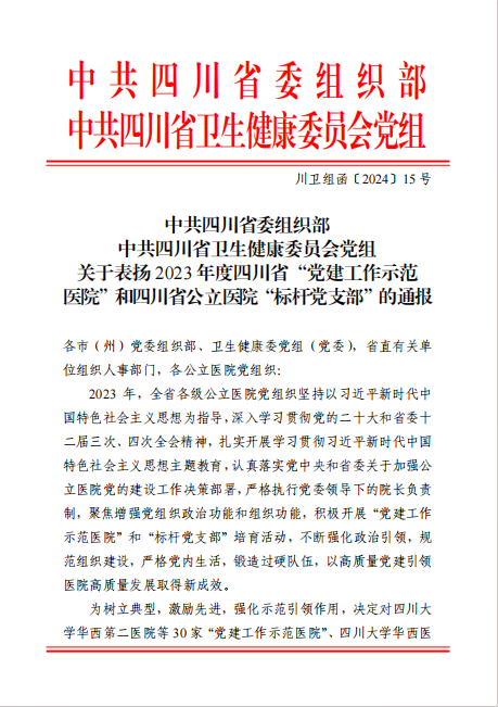 近日,中共四川省委組織部、中共四川省衛(wèi)生健康委員會(huì)黨組發(fā)文通報(bào)表?yè)P(yáng)了2023年度四川省“黨建工作示范醫(yī)院”和公立醫(yī)院“標(biāo)桿黨支部”(川衛(wèi)組函〔2024〕15號(hào)),安岳縣人民醫(yī)院榮獲2023年度四川省“黨建工作示范醫(yī)院”!