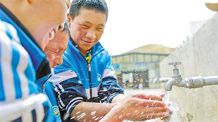 謝通門縣縣城自來水管網(wǎng)升級(jí)改造后,學(xué)生用自來水洗手。