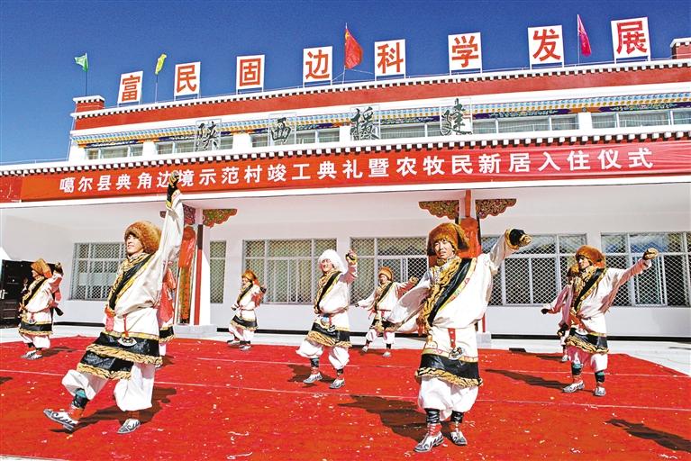 2012年10月,陜西省援建的阿里地區(qū)首個邊境小康示范村——噶爾縣扎西崗鄉(xiāng)典角村竣工。這是入住儀式上,群眾跳起歡快的舞蹈。