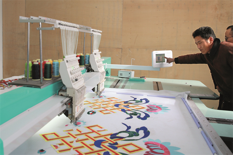 洛隆縣博織利民服飾有限公司總經(jīng)理向巴在操作電子刺繡機刺繡帳篷上的花紋圖案。陳衛(wèi)國 攝