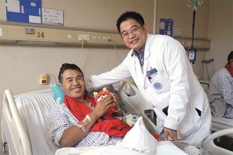 1月25日下午四點(diǎn)左右,兩名接受骨關(guān)節(jié)置換手術(shù)的病人陸續(xù)回到病房,主刀醫(yī)生林劍浩神色輕松,向陪護(hù)家屬和同病房的病人輕輕點(diǎn)頭。“手術(shù)很成功,病人目前狀況穩(wěn)定,沒(méi)有出現(xiàn)術(shù)前擔(dān)憂的情況,太幸運(yùn)了?!边@句話使原本沉寂的病房頓時(shí)充滿了生氣,病友們齊刷刷地豎起了大拇指。2015年以來(lái),北京大學(xué)人民醫(yī)院骨關(guān)節(jié)科主任林劍浩及其團(tuán)隊(duì)一直無(wú)償?shù)貫槲鞑夭嫉拇蠊枪?jié)病患者開展關(guān)節(jié)置換、關(guān)節(jié)矯形等救治工作。