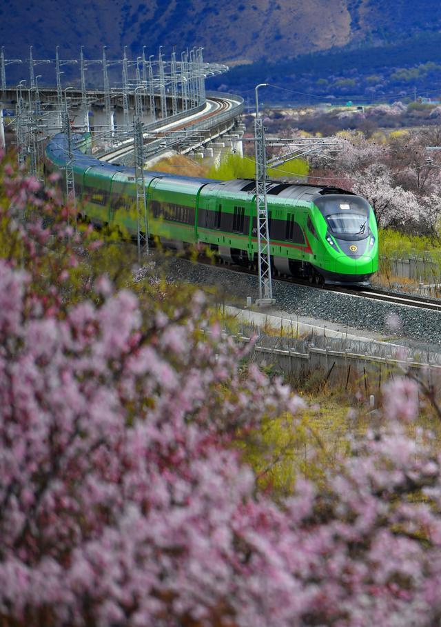2023年3月21日,復(fù)興號(hào)列車穿行在西藏拉林鐵路林芝段的桃花間。新華社記者 覺(jué)果 攝