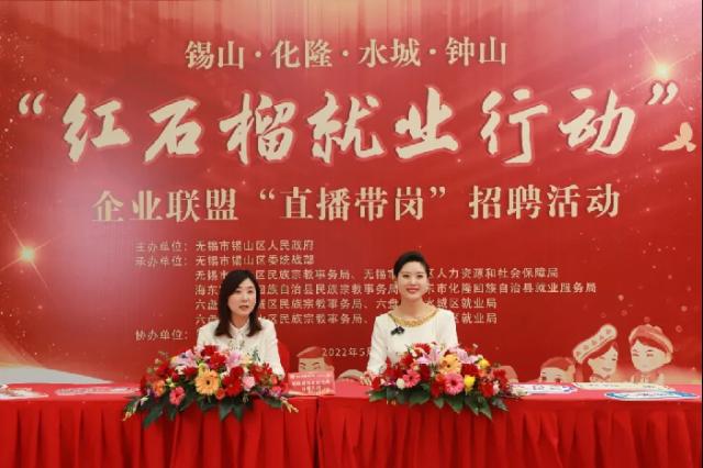 江蘇深入實(shí)施“紅石榴”就業(yè)行動(dòng)。截至今年7月,全省13個(gè)設(shè)區(qū)市的410家企業(yè)累計(jì)面向民族地區(qū)各族群眾提供3.45萬(wàn)個(gè)就業(yè)崗位。圖為江蘇省無(wú)錫市錫山區(qū)與貴州省六盤水市水城區(qū)、鐘山區(qū),青海省海東市化隆回族自治縣通過(guò)網(wǎng)絡(luò)平臺(tái)舉行“紅石榴就業(yè)行動(dòng)”合作簽約暨企業(yè)聯(lián)盟“直播帶崗”招聘活動(dòng)。江蘇省民族宗教事務(wù)委員會(huì)供圖