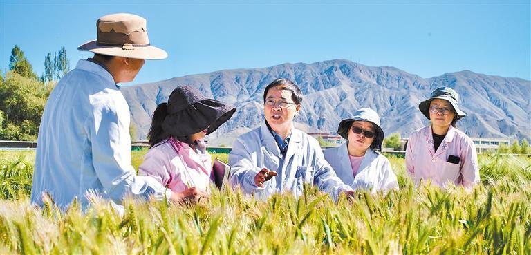8月16日,山東援藏農(nóng)業(yè)專家、日喀則市農(nóng)牧業(yè)科學研究推廣中心副主任張斌(中)在青稞試驗田里指導種植。經(jīng)濟日報記者 袁勇 攝
