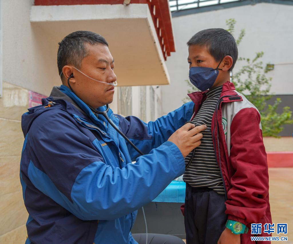 7月4日,耿直醫(yī)生在給那曲市色尼區(qū)尼瑪鄉(xiāng)小學(xué)學(xué)生做心臟聽(tīng)診。(新華社記者 邵澤東 攝)
