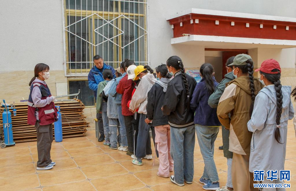 4日上午,在那曲市色尼區(qū)尼瑪鄉(xiāng)小學(xué)學(xué)生宿舍一樓大廳,學(xué)生們齊刷刷排成隊(duì)等待做心臟聽(tīng)診?!奥?tīng)診有問(wèn)題的同學(xué),由老師帶去做心臟彩超?!鳖I(lǐng)隊(duì)醫(yī)生耿直一邊吸氧一邊聽(tīng)診。
