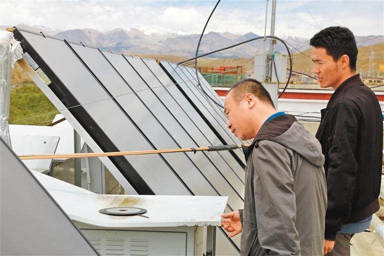 圖為香孜鄉(xiāng)干部在檢查太陽(yáng)能供熱設(shè)備。記者 永青 扎西羅布 攝