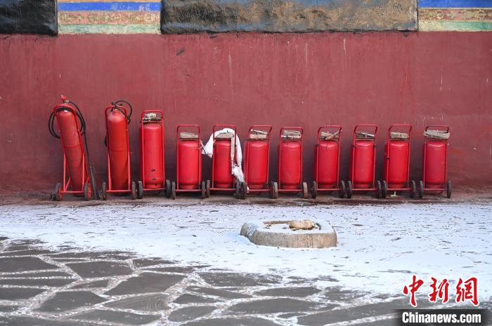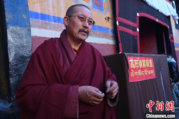 圖為洛卓土美介紹薩迦寺內消防情況。趙朗 攝
