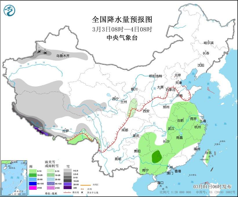 3月3日08時(shí)至4日08時(shí),新疆伊犁河谷、西藏南部和西部等地部分地區(qū)有中到大雪,其中,西藏南部部分地區(qū)有暴雪到大暴雪,局地特大暴雪(30~40毫米)。黃淮西部、江淮、江漢東部、江南大部、西南地區(qū)東南部、華南大部等地部分地區(qū)有小到中雨。