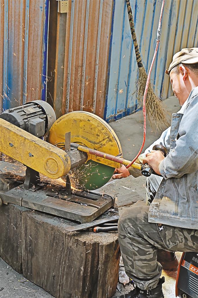 沿著民居錯(cuò)落的小路攀爬而上,來(lái)到江拉村易貢藏刀打制農(nóng)牧民合作社,傳承人西洛正在和線上購(gòu)買者交流。寬敞的院壩和簡(jiǎn)易工作間里,木屑紛飛、火花四濺、錚錚有聲,幾十個(gè)村民正在藏刀制作“流水線”上忙碌,一路采訪下來(lái),我們也大致明白了易貢藏刀的制作流程: