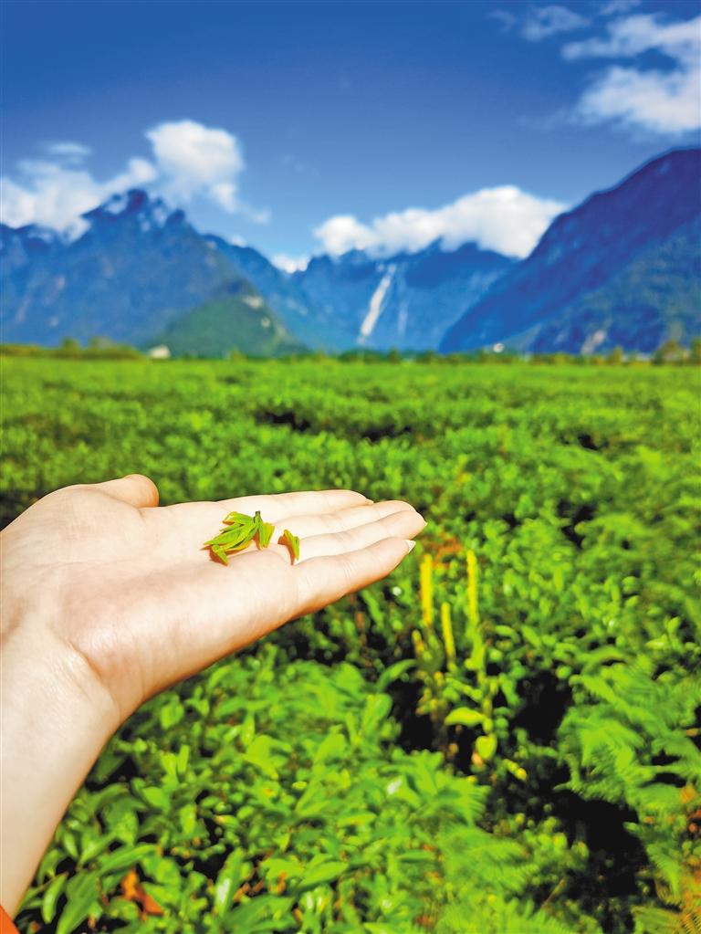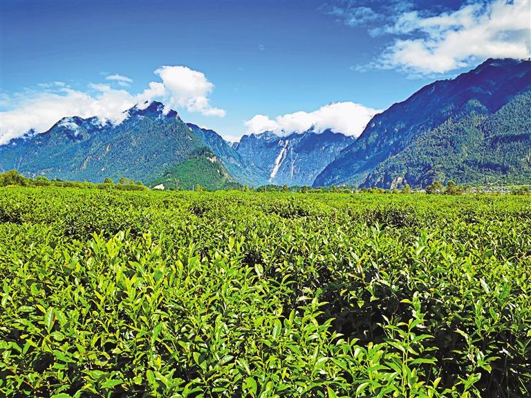 眼前,翠綠欲滴的千畝茶田連接碧色天空,連綿不絕的雪山聳入云霧,清水潺潺的聲音環(huán)繞耳邊,牛羊時(shí)不時(shí)抬頭望向行人。易貢茶場(chǎng)平均海拔2200米,雖地處青藏高原,但來(lái)自印度洋的暖濕氣流沿著雅魯藏布大峽谷進(jìn)入高原,為這片高原茶田帶來(lái)豐沛的降水?!岸瑹o(wú)嚴(yán)寒,夏無(wú)酷暑”,使茶樹能夠在這里茁壯成長(zhǎng)。