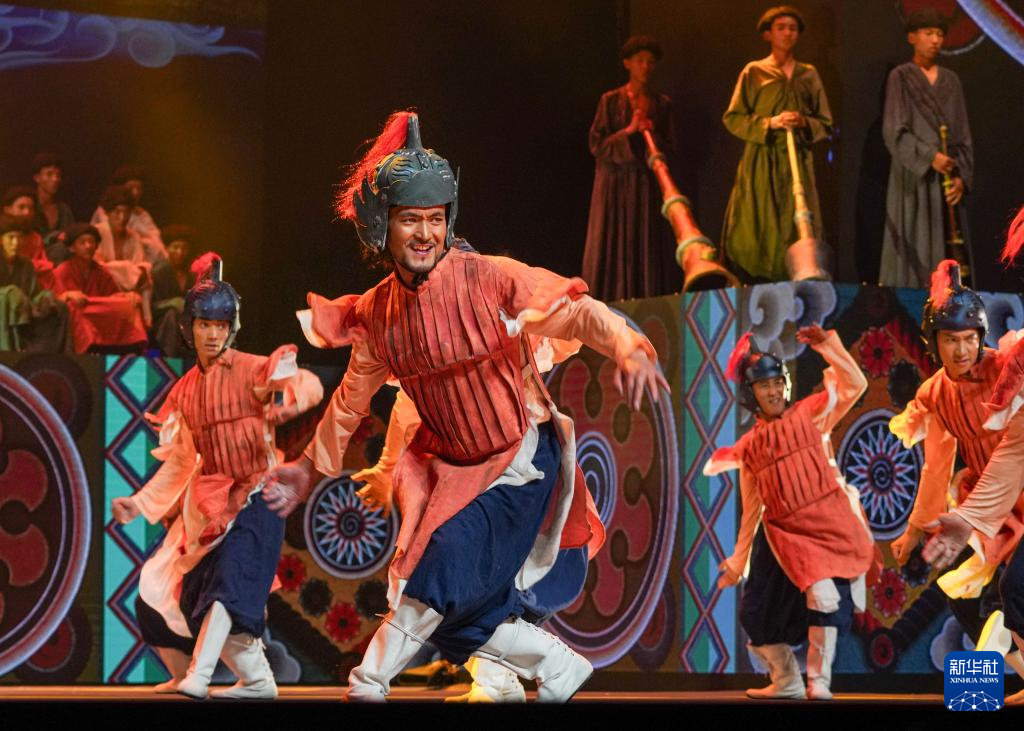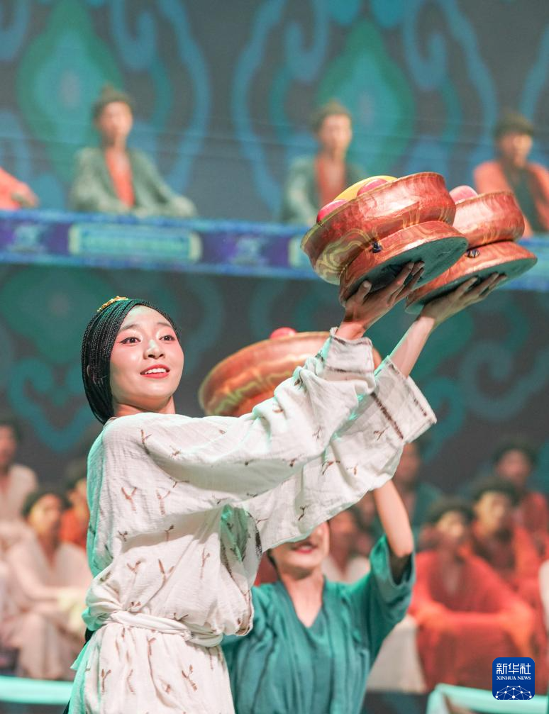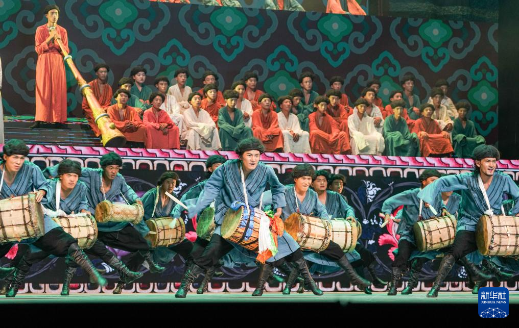 7月19日,在西藏拉薩《緣起象雄·古格遺風(fēng)》情景歌舞詩(shī)演出現(xiàn)場(chǎng),演員在表演節(jié)目《鼓樂(lè)喧天》。新華社發(fā)(格桑雍珍 攝)