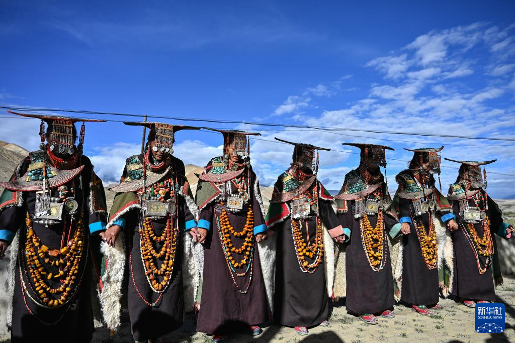 9月9日,在西藏阿里地區(qū)普蘭縣科迦村,村民展示普蘭服飾。新華社記者 孫瑞博 攝