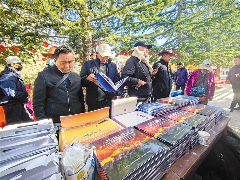 圖為市民在觀看關(guān)于西藏題材的畫(huà)冊(cè)。記者 洛桑 攝
