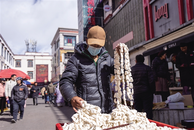 漫步在拉薩的大街小巷,“年的味道”愈發(fā)濃厚,家家戶(hù)戶(hù)采辦年貨的熱情也日益高漲,呈現(xiàn)出一派紅紅火火的熱鬧景象。那么,你知道藏歷新年的特色年貨都有哪些嗎?“羅薩梅朵”、羊頭、酥油花、“切瑪盒”……這些傳統(tǒng)年貨寓意著新的一年風(fēng)調(diào)雨順、五谷豐登、吉祥如意,是藏歷新年“必不可少”的年貨。2月21日,記者走上街頭,沉浸式體驗(yàn)充滿“煙火氣”的濃濃年味。