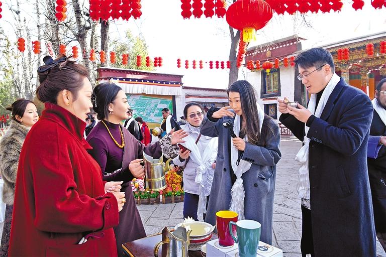 隨著一聲聲“扎西德勒!”“新年快樂!”的祝福語響起,身著盛裝的工作人員站在切瑪盒旁邊,熱情地教游客吃“切瑪”。“切瑪”盒里滿滿的青稞粒和糌粑,再加上金燦燦的酥油花和染成紅綠兩色的“羅薩梅朵”麥穗的裝點,象征著五谷豐登、福澤綿長。來自廣東的游客張女士一家是專程趕來過藏歷新年的,想來體驗不同年味兒的她輕捏一撮切瑪撒向空中:“愿我們全家健康平安,也祝祖國繁榮昌盛!”