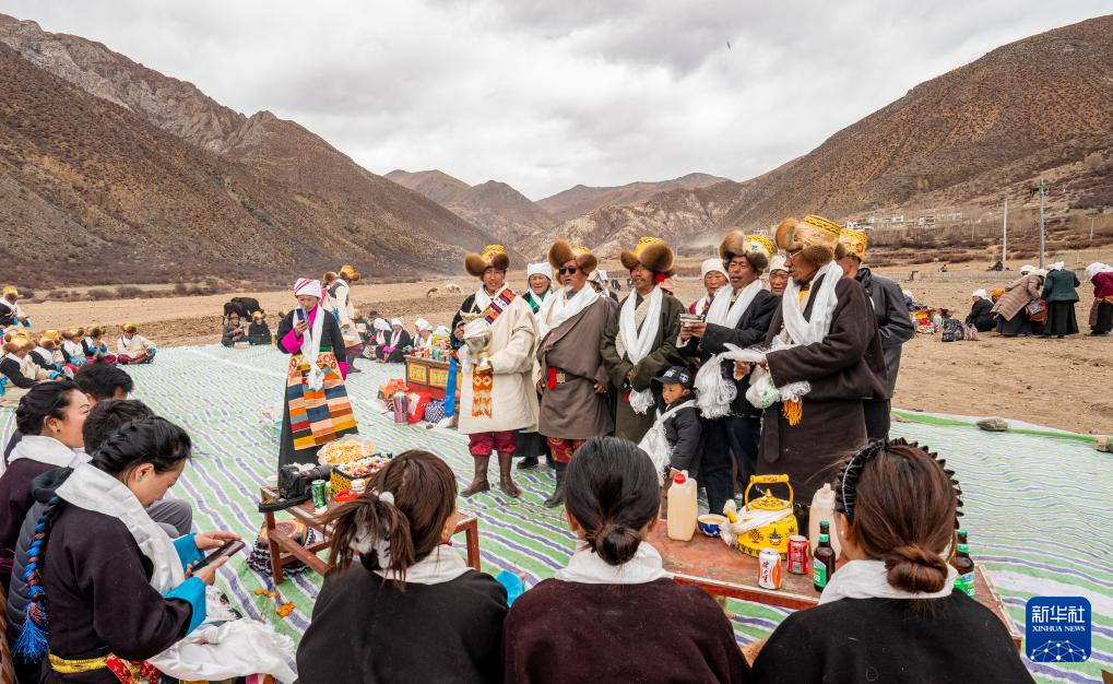 旺慶老人(右)在春耕大典上為客人敬酒獻唱(3月16日攝)。新華社記者 晉美多吉 攝