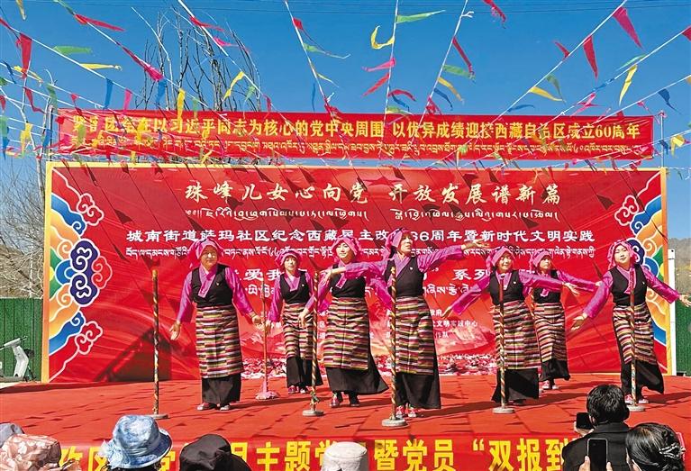 3月28日,日喀則市桑珠孜區(qū)城南街道薩瑪社區(qū)舉行紀(jì)念西藏民主改革66周年暨新時代文明實踐“我愛我家 幸福日喀則”活動演出現(xiàn)場。通訊員 次旦玉珍 攝