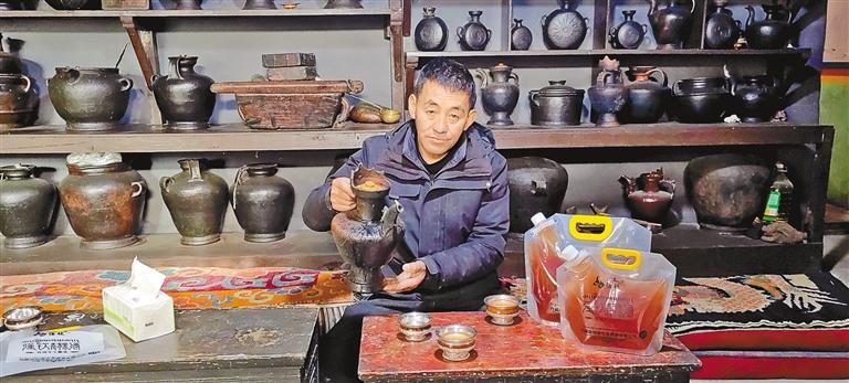 洛桑多吉在自家工坊內(nèi)品嘗自釀的“強(qiáng)欽青稞酒”。 圖/文 記者 王超 見(jiàn)習(xí)記者 土旦仁青