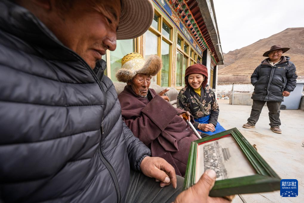 索扎老人和家人觀看當(dāng)年在天安門前拍的照片(3月20日攝)。新華社記者 丁增尼達(dá) 攝