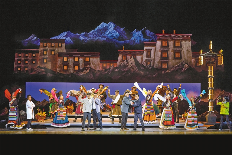 該劇以北京援藏干部程燕杰、宋亦樂等人在拉薩的工作生活為主線,運用真實細膩的敘事與多元融合的藝術手法,生動展現(xiàn)援藏干部的敬業(yè)精神。舞臺上,援藏干部面對“凈水工程受阻”“學校選址爭議”等挑戰(zhàn)時的責任擔當,他們“缺氧不缺精神、艱苦不怕吃苦、海拔高境界更高”的堅韌品質,深深打動現(xiàn)場觀眾。