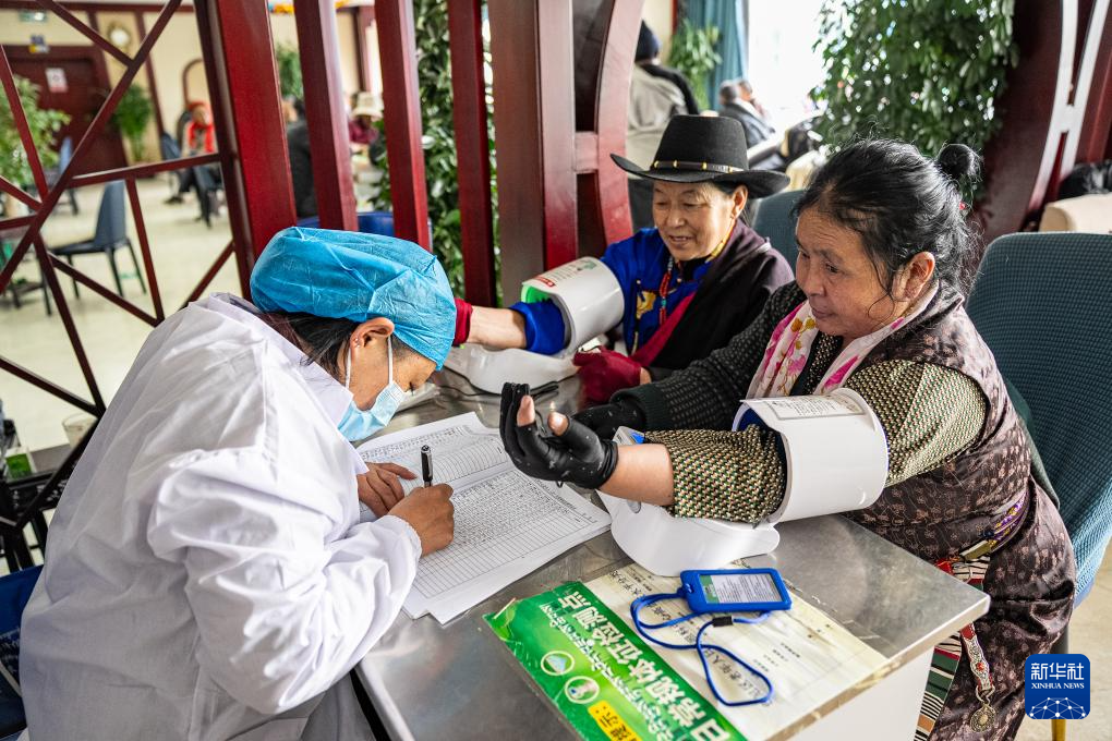 4月25日,在那曲市色尼區(qū)老年人日間照料中心,老人在測量血壓。新華社記者 丁增尼達 攝