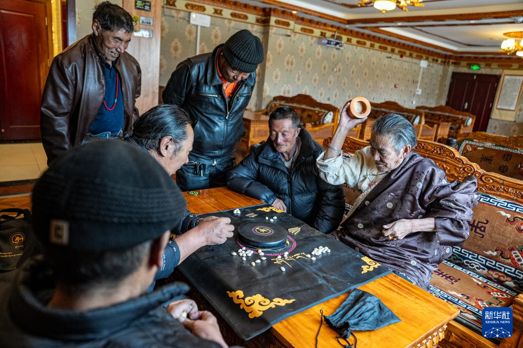4月25日,老人們在那曲市色尼區(qū)老年人日間照料中心玩藏式骰子。新華社記者 丁增尼達 攝