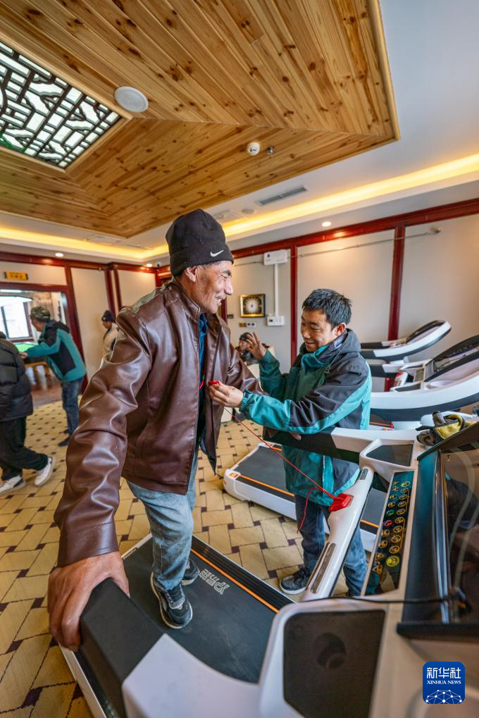 4月25日,在那曲市色尼區(qū)老年人日間照料中心,工作人員陪同老人在跑步機上做運動。新華社記者 丁增尼達 攝