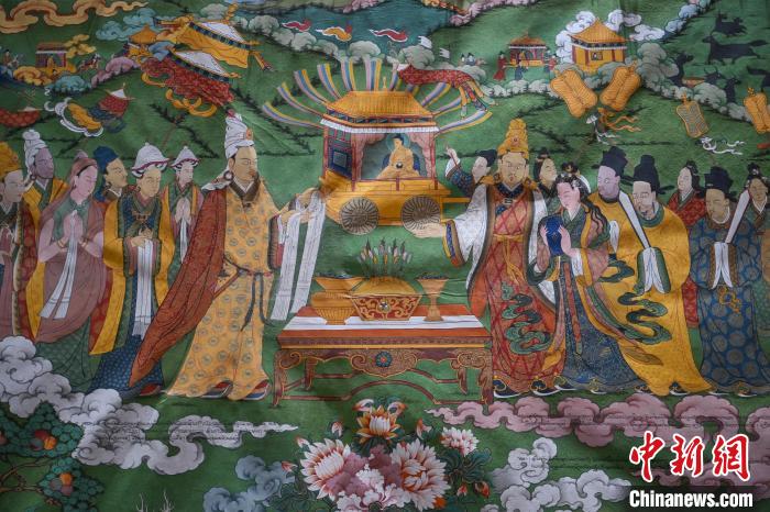 圖為民眾參觀唐卡《吐蕃贊普世系大唐卡金子明鏡》。貢嘎來松 攝