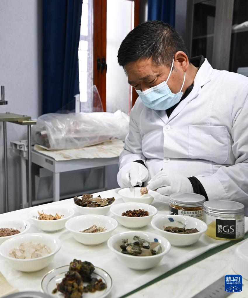 布達(dá)拉宮貝葉經(jīng)實(shí)驗(yàn)性修復(fù)小組實(shí)驗(yàn)室工作人員對用于貝葉修復(fù)的粘合劑原料進(jìn)行加工(5月25日攝)。新華社記者 李賀 攝