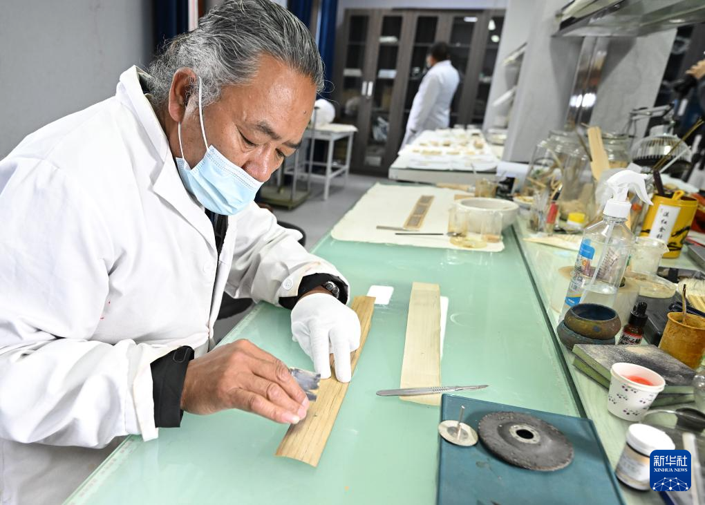 布達(dá)拉宮貝葉經(jīng)實(shí)驗(yàn)性修復(fù)小組實(shí)驗(yàn)室工作人員對貝葉進(jìn)行處理(5月25日攝)。新華社記者 李賀 攝