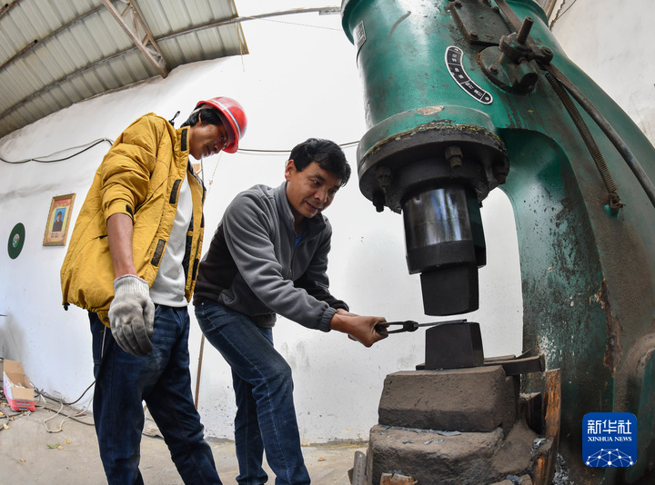 寸昆杰(右)正在制作洛隆藏刀。新華社記者 晉美多吉 攝